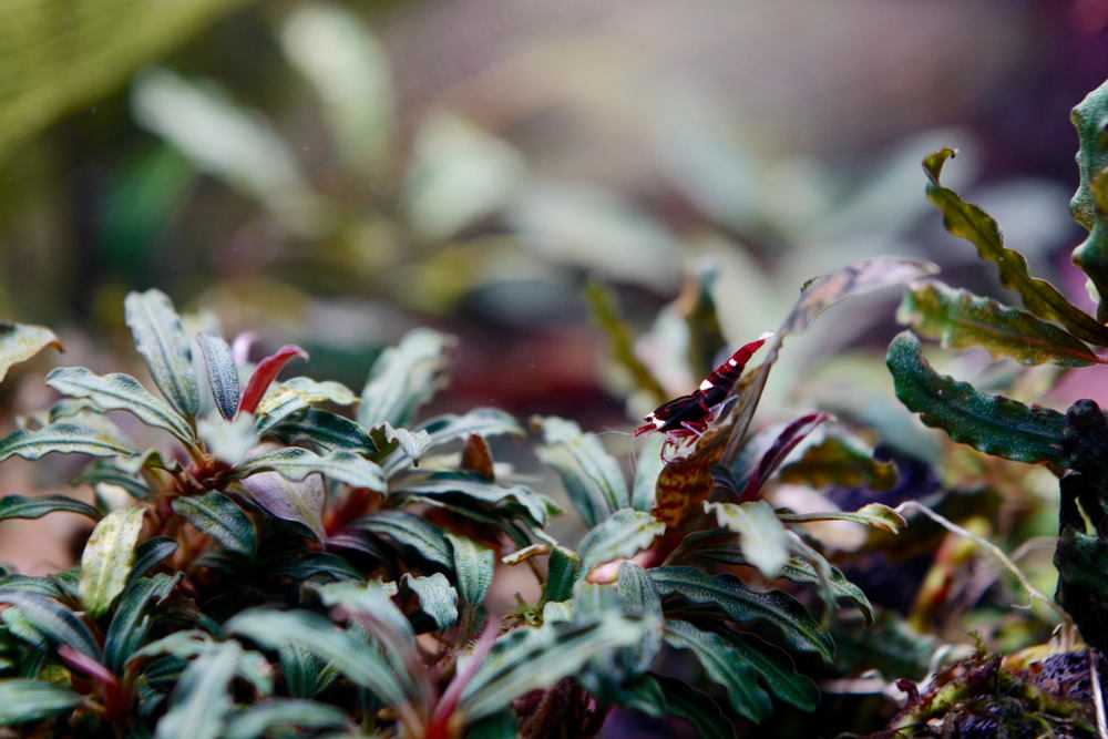 Винна червона креветка Caridina в лісі буце