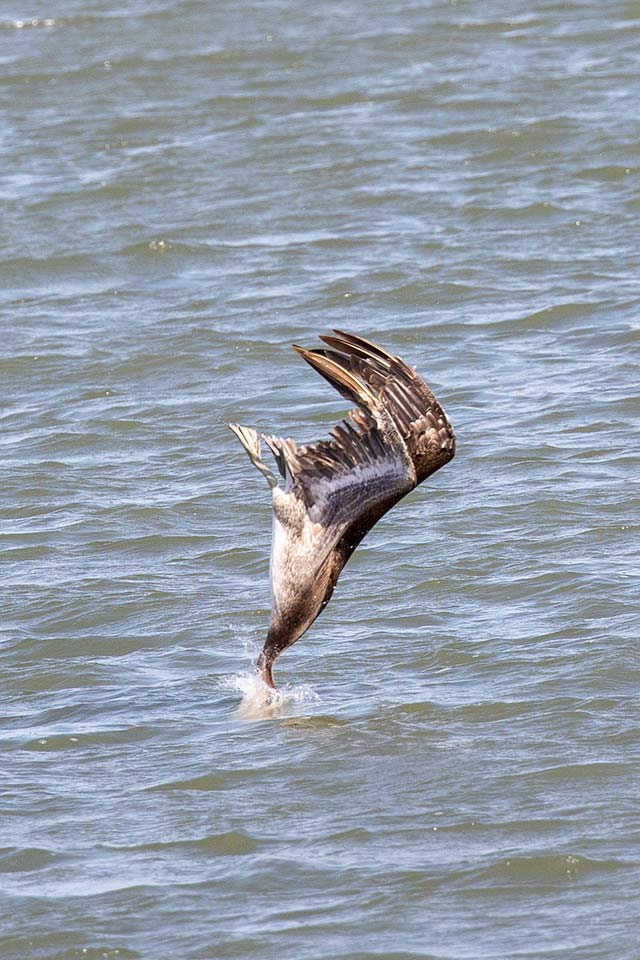 Я спостерігав, як бурі пелікани ловлять наноси й дивляться вниз, доки різко не повертаються, щоб зануритися головою вперед у воду. Один птах зробив це кілька разів поспіль протягом кількох хвилин. Я не впевнений, чи він був невдалим, чи щоразу щось отримував.