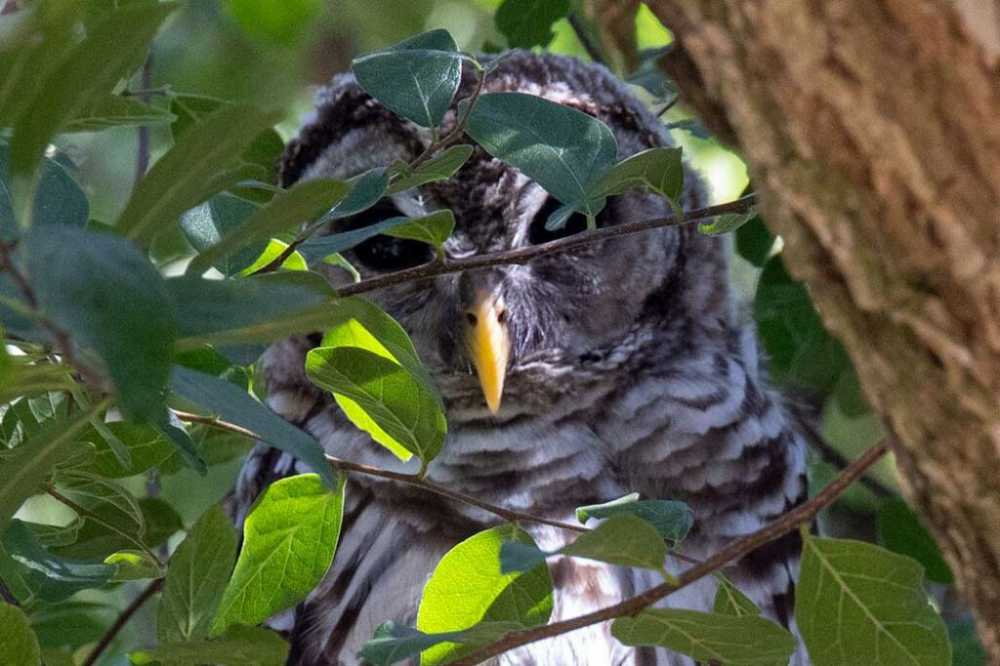 Я підійшов до другої жалюзі й побачив, що там люди балакають про птахів і сусідів. Вони поспішили вказати на обіцяну Сову. Знову за допомогою лазера, той самий чоловік вказав нам, де шукати на дереві. Не турбуючись на нашу присутність, сова зайнялася прикрасою. Це надає широкі можливості для фотографій і відео.