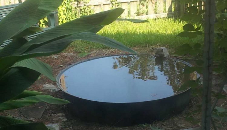 Сірий Кіт п’є з дивного маленького ставка в палісаднику.
